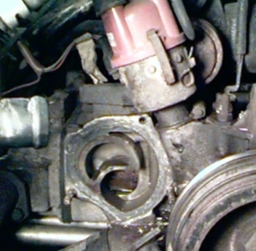 old gasket material from the thermostat housing and the mating surfaces for the coolant pipes.