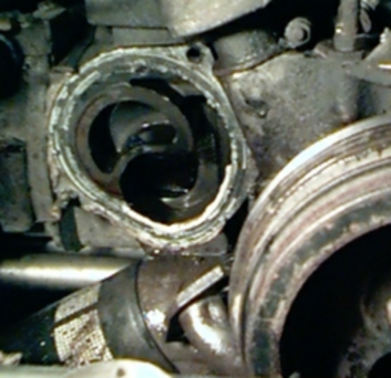 On the left, you can see the sealant residue from the water pump. The view to the right shows the