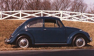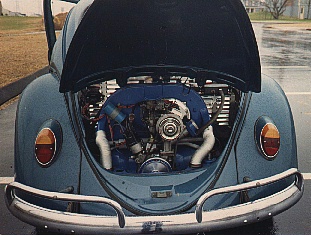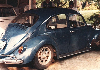 Once the engine was running, I did some minor bodywork before having it repainted the original Sea Blue color. The picture to the left shows the bug just days after being repainted. Over the next several years, I made several modifications. I lowered the front end, added front disk brakes and converted it to 4-bolt wheels all around. Then I installed a set of original Porsche 2-liter alloy wheels that I had fully polished.